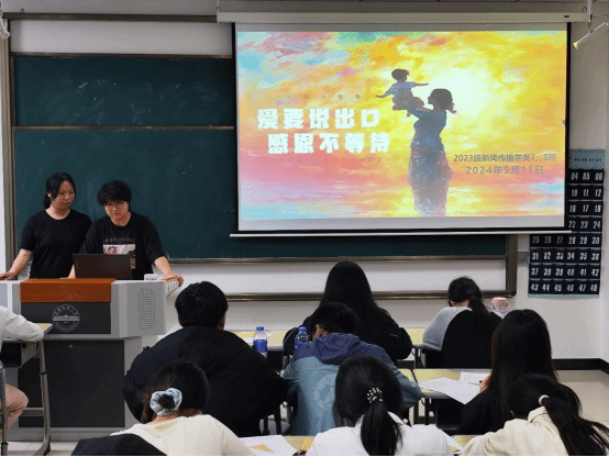 “同學們,猜一猜明天是什么節日???”“母親節!”5月11日,新聞傳播學類專業2023(7)、(8)班在K202教室開展以“愛要說出口,感恩不等待”為主題的團建活動。活動開始前,活動負責人、新聞傳播學類專業2023(7)、(8)班的班長楊雨霏、朱研溪提前為每位同學準備好信紙和信封。朱研溪說:“我們希望通過寫信這種傳統而深情的溝通方式,讓同學們勇敢表達自己的心聲,將對母親的愛訴說于筆尖。”學生們觀看一段關于母愛的感人短片后,...